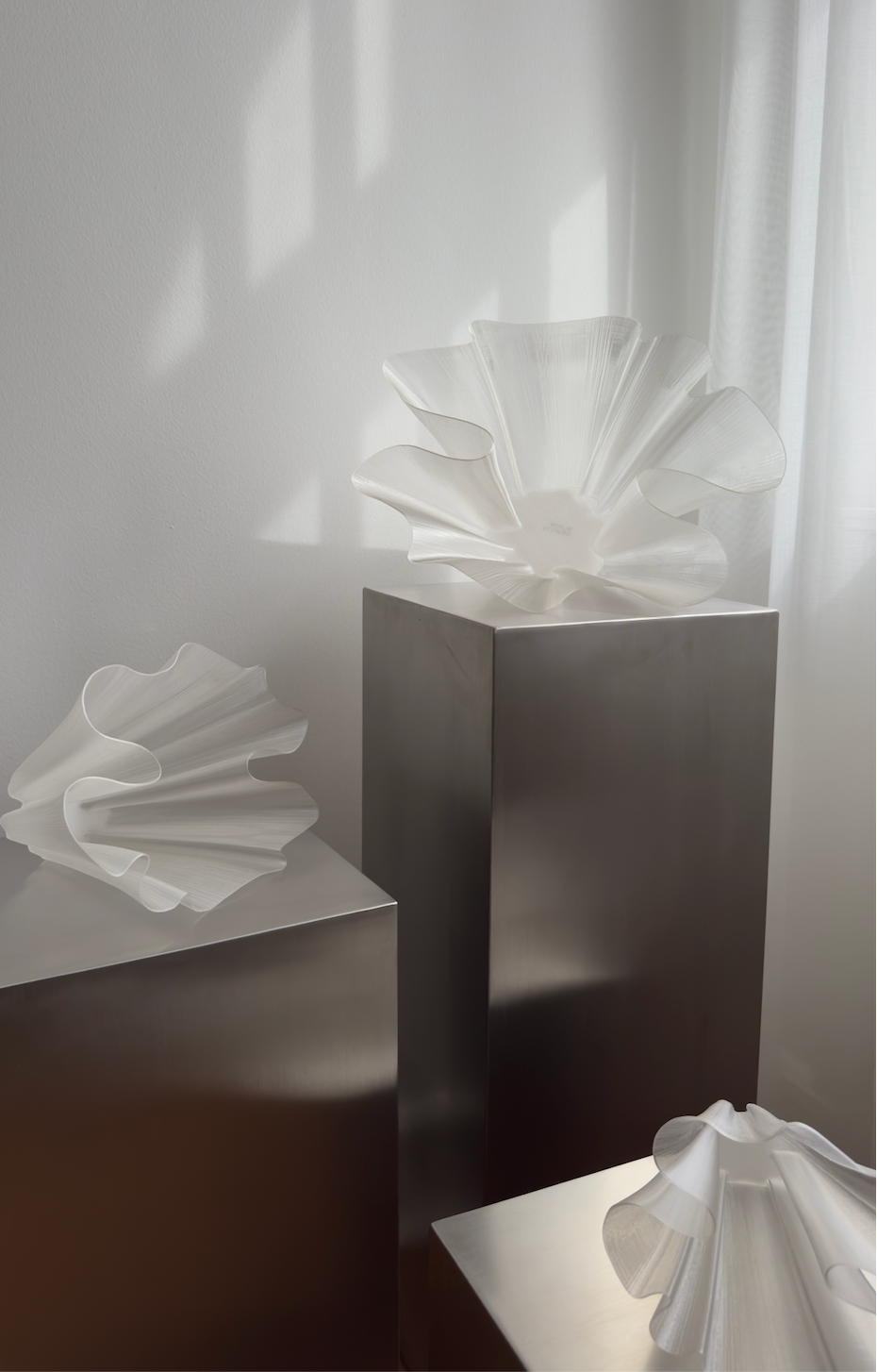 The vases are made using advanced 3D printing technology, which allows us to create complex organic shapes that cannot be found in traditional vase production. It is a symbiosis of art and technology that will take your interior design to a whole new level. The objects are made of bioplastic, which makes them airy and easy to hold, while a graceful curve brings movement and energy to any room.