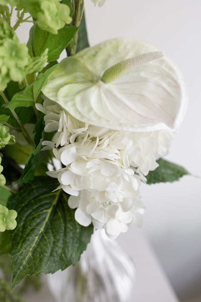 Anthurium: Den hvide og grønne anthurium fanger øjet med sit skinnende, hjerteformede blad og kontrasterende nuancer, der tilfører et frisk og elegant raffinement.