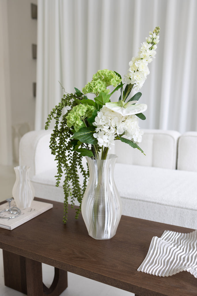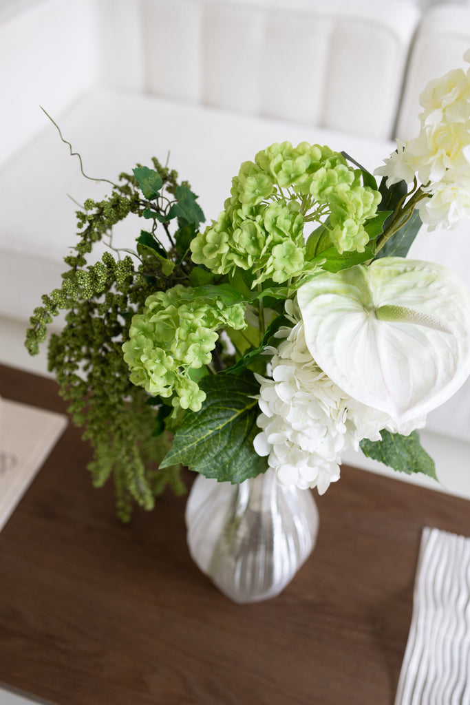 Trio Hortensia - Grøn: Trio-hortensiaen i grøn stråler med sine fyldige blomster og friske grønne nuancer, der tilfører en naturlig og moderne elegance.
