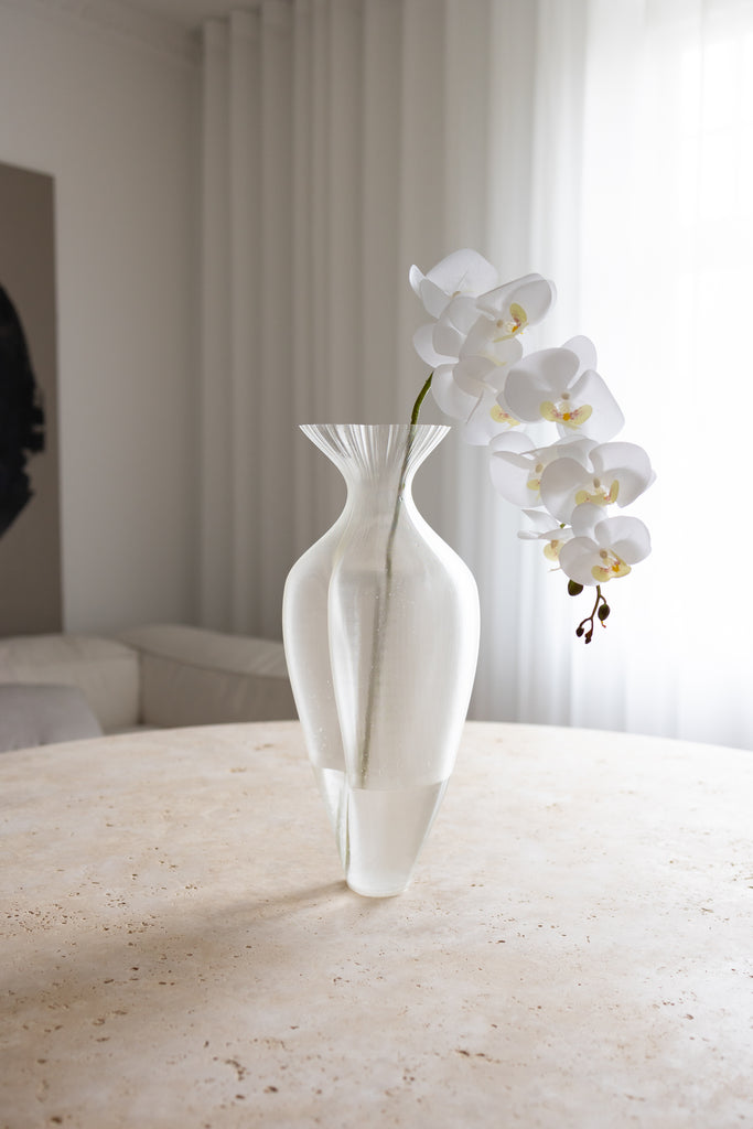 Tempus-vasen er et letvægtsobjekt med en organisk form, designet som et skulpturelt element til hjemmet. "Tempus" betyder 'tid' på latin og refererer til fortid, nutid og fremtid. Vasen har en asymmetrisk form, hvor hver side præsenterer sit eget distinkte design, hvilket gør den visuelt interessant fra alle vinkler. Den ene side har en glat og elegant overflade, mens den anden side har et mere tekstureret og organisk udtryk. Dette giver dig mulighed for at vælge, hvilken side der bedst passer til din indretning.
