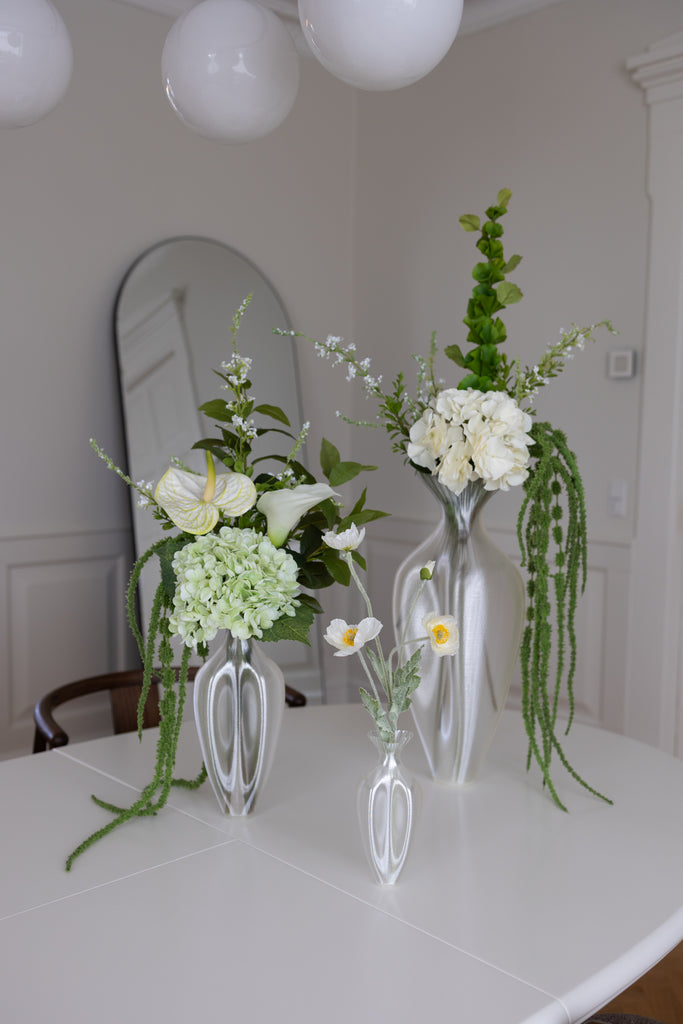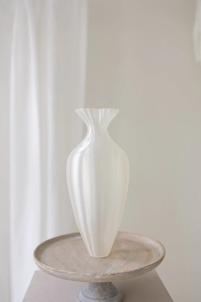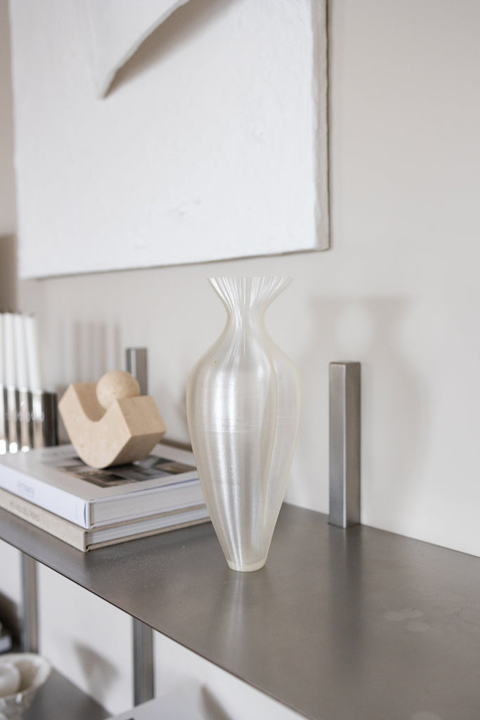 Tempus-vasen er et letvægtsobjekt med en organisk form, designet som et skulpturelt element til hjemmet. "Tempus" betyder 'tid' på latin og refererer til fortid, nutid og fremtid. Vasen har en asymmetrisk form, hvor hver side præsenterer sit eget distinkte design, hvilket gør den visuelt interessant fra alle vinkler. Den ene side har en glat og elegant overflade, mens den anden side har et mere tekstureret og organisk udtryk. Dette giver dig mulighed for at vælge, hvilken side der bedst passer til din indretning.