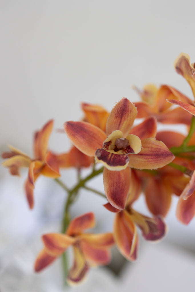 Vi præsenterer vores naturtro lille orange Cymbidium - en livlig og elegant blomst, der tilfører et varmt og farverigt touch til ethvert rum.