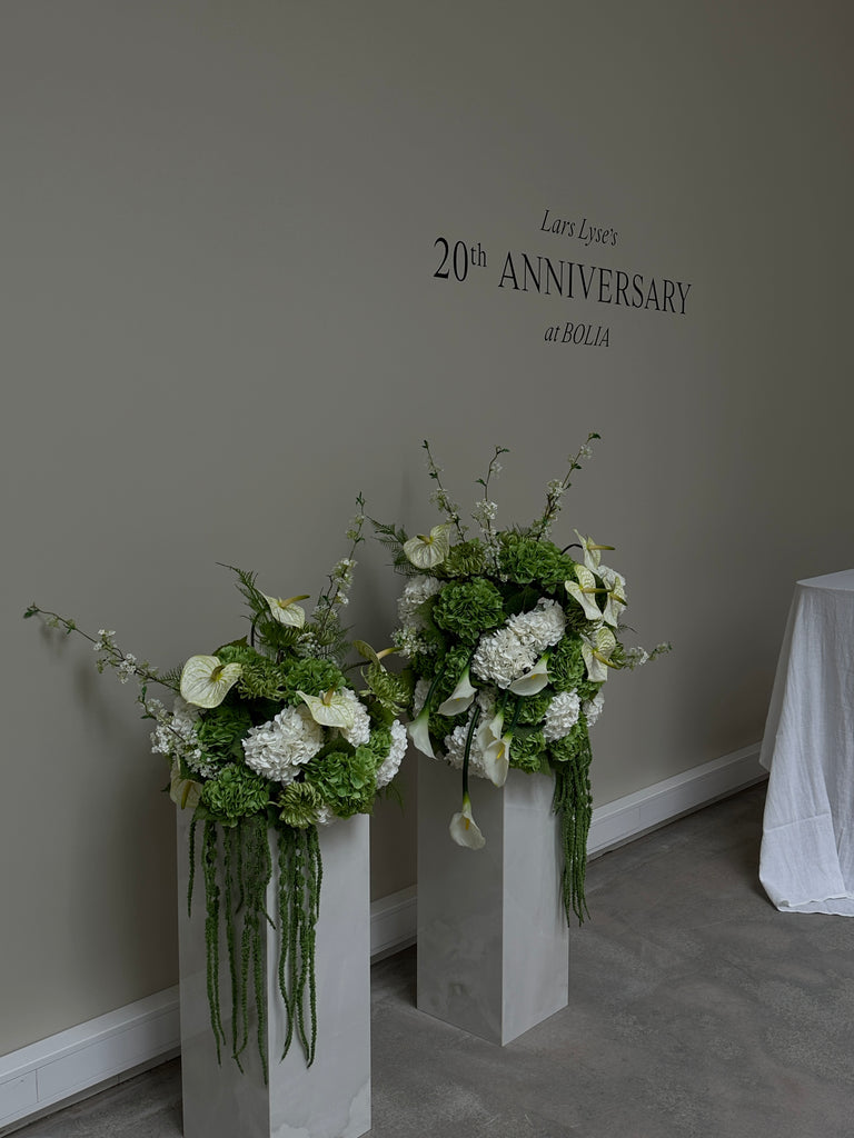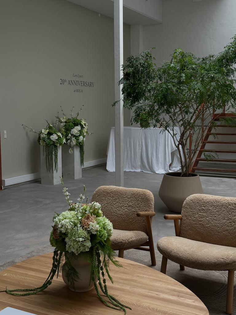 Til Bolias 20 års jubilæum skabte vi store installationsdekorationer, der indrammede fejringen med et udtryk af kreativitet og håndværk. Installationerne udfoldede sig som skulpturelle værker, hvor naturlige former blev forenet med raffinerede detaljer, og var skabt til at oversætte vores univers ind i Bolias designverden.