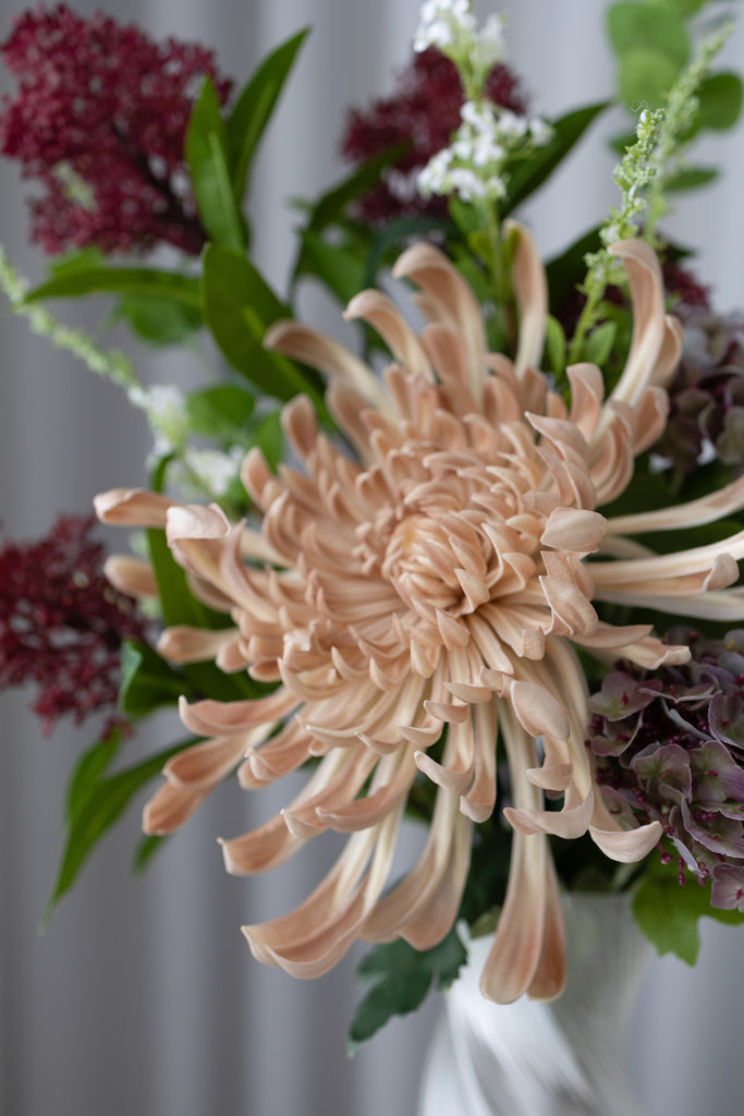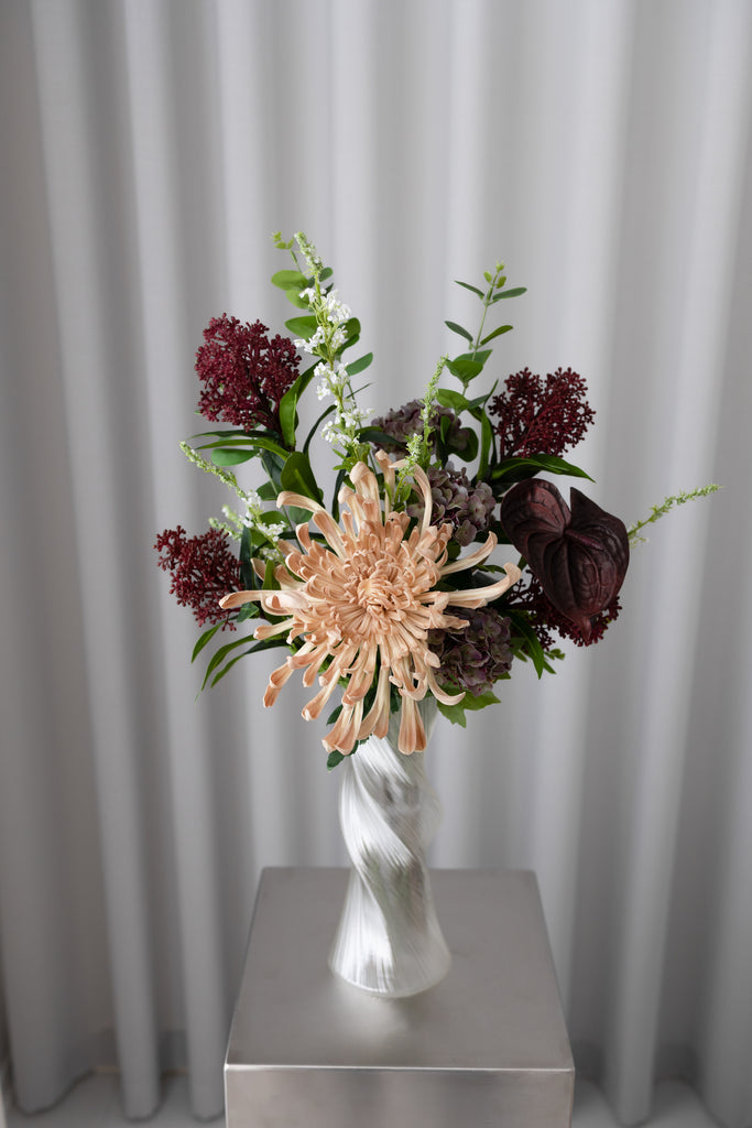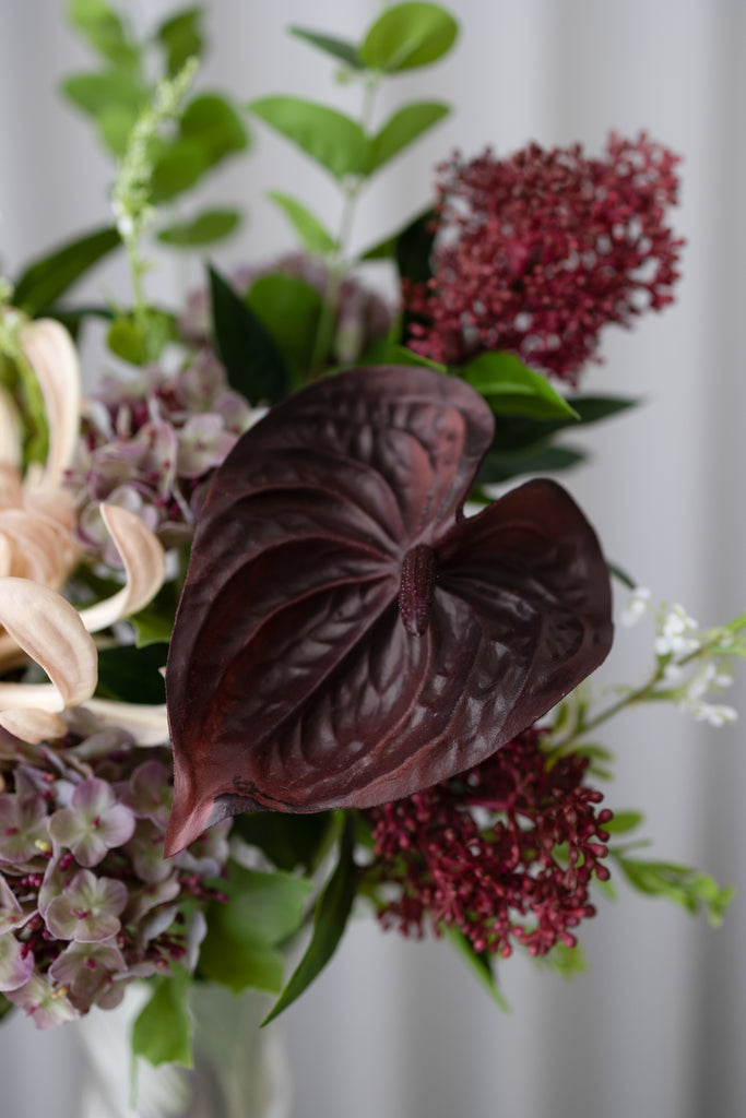 Chrysanthemum - Beige, Plant - White, Snowball Hydrangea - Purple, Eucalyptus, Skimmia Berry - Red (2x), Anthurium - Bordeaux
