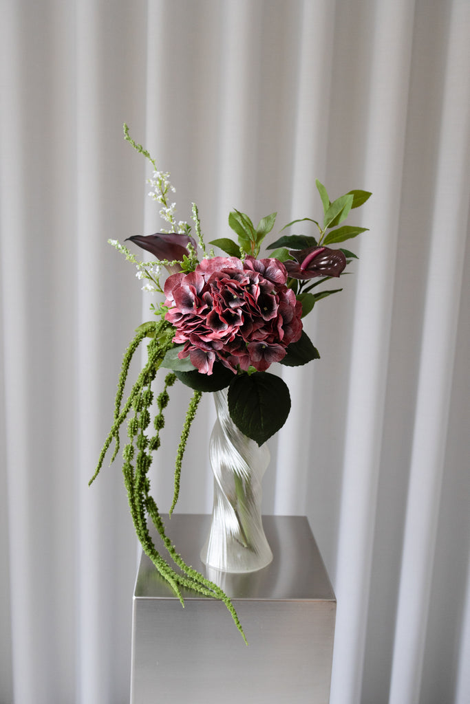 These artificial lifelike flowers bring enduring elegance to your surroundings. Embrace the warmth and cheer of nature without the need for maintenance. Elevate your home or office with the timeless beauty of the Bordeaux Bliss Bouquet.